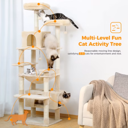 - Endless Climbing Fun: With the total height of 72″ in 8-level structure, the super large cat tree is perfect for 4-5 big cats who love climbing up and down together. The needs of scratching, climbing, sleeping and exercising can also be fully satisfied! Especially the unique rectangle super large cat condo and wide hammock are much larger than normal ones and perfect for cats resting together.